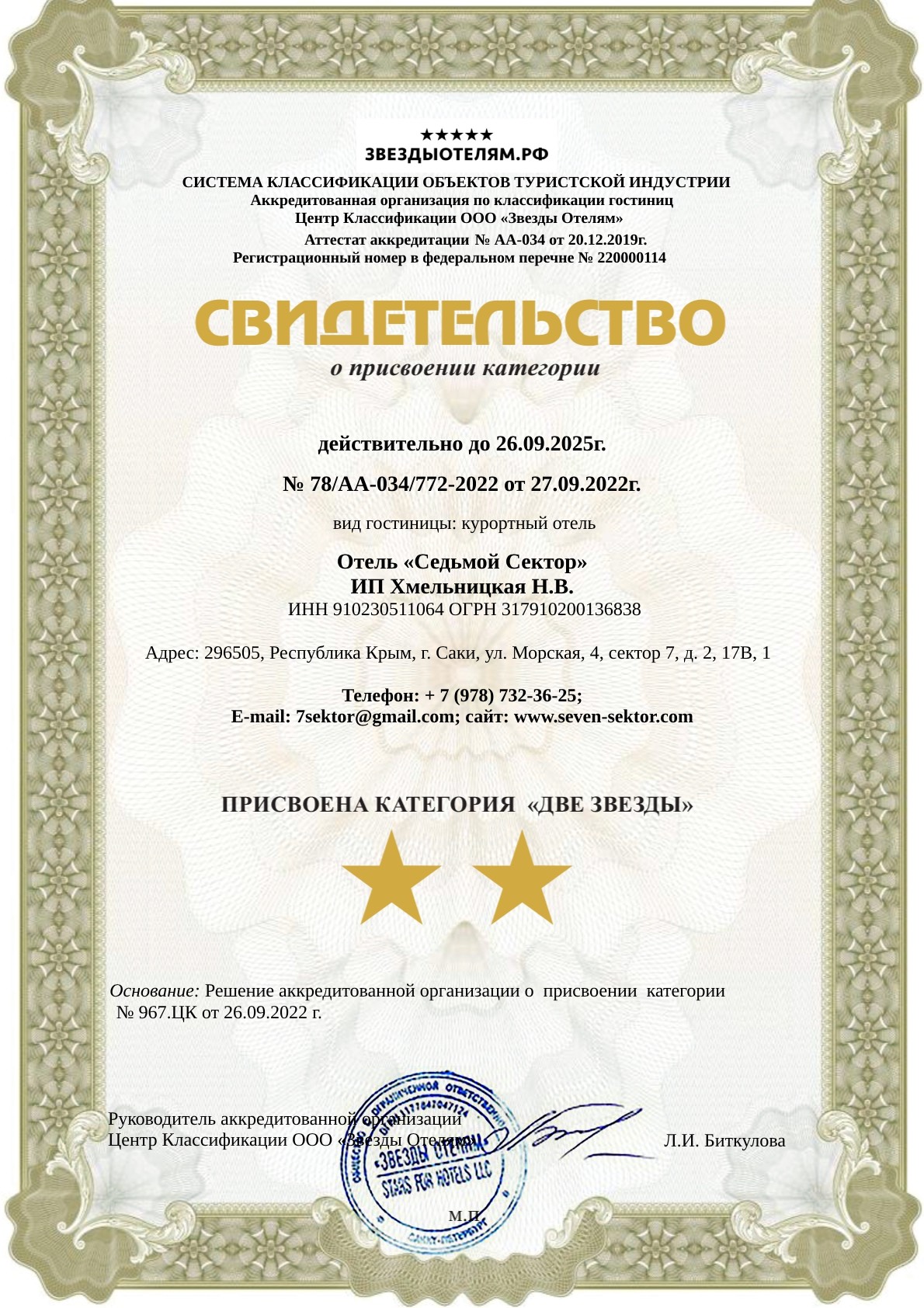 В 2024 году Отелю "Седьмой Сектор" в системе классификации объектов туристической индустрии была присвоена категория "Две Звезды".